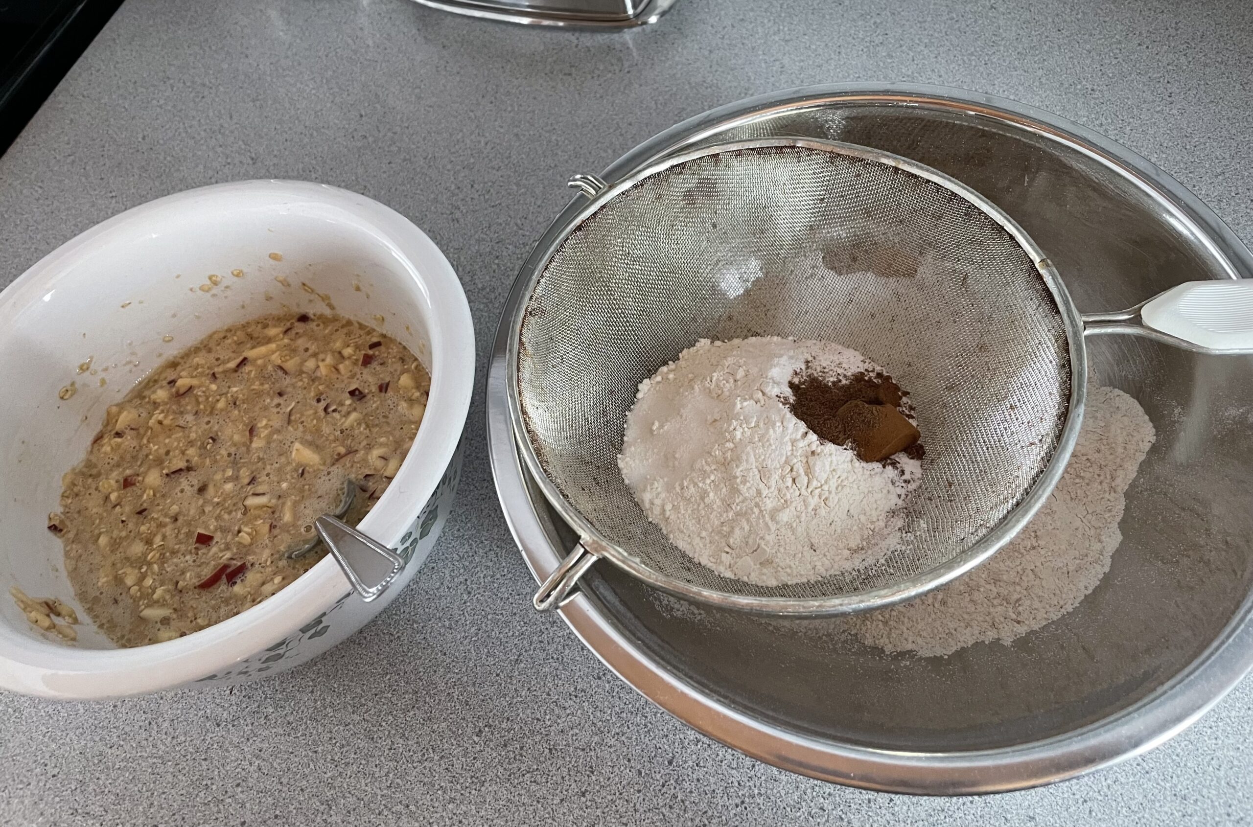 - Dans un autre bol, mélanger les farines, la poudre à pâte, la cannelle, le sel et la muscade.